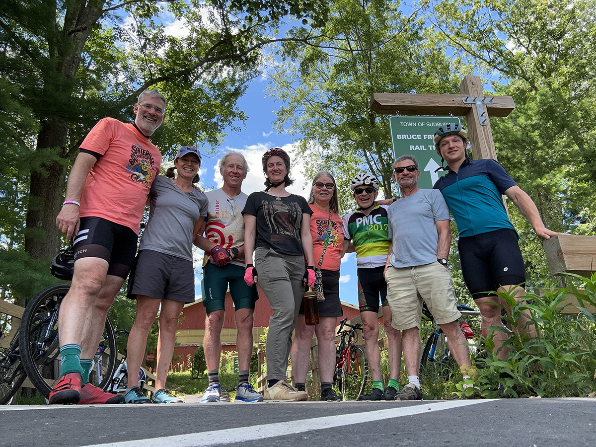 To learn about the trail and network with fellow advocates, the ride featured two advocates who have been working on the trail for decades, each providing a perspective on how local advocacy kept pushing on the ground in Sudbury to bring about this regional asset. Before we got on our bikes, Barbara Pike, a long term Board member of the Friends of the Bruce Freeman Rail Trail, discussed the decades of advocacy required to get the trail funded and organized. She explained the challenges getting approval for the construction and consistency along the trail. Barbara was one of the original advocates of the Bruce Freeman Rail Trail and still remains active to this day.