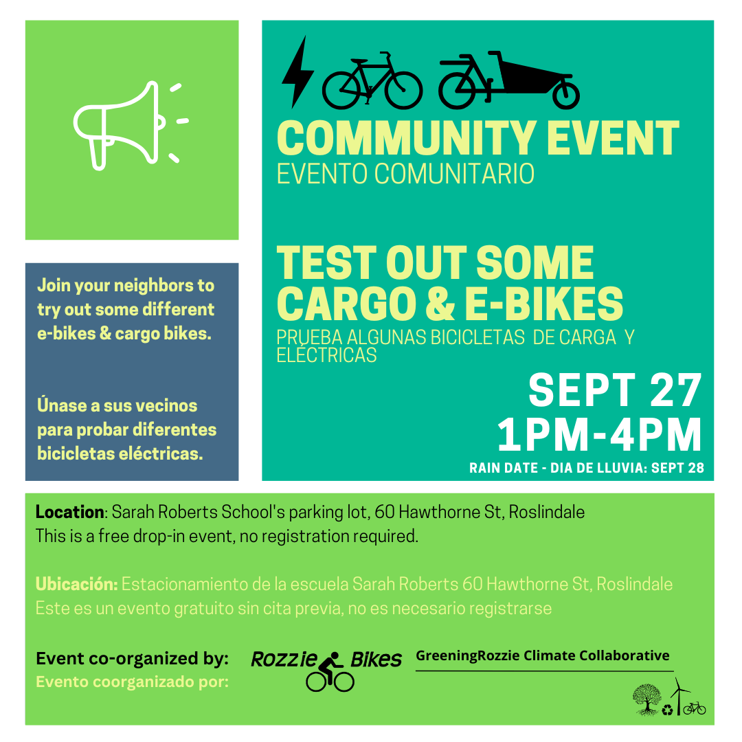 Interested to test-ride some cargo and e-bikes? Stop by Sarah Robert's School parking lot, 60 Hawthorn St on Saturday, Sept 27 (rain date: Sept 28) from 1:00 p.m. - 4:00 p.m. This is a Free event, co-organized by RozzieBikes and GreeningRozzie Climate Collective, no registration required.