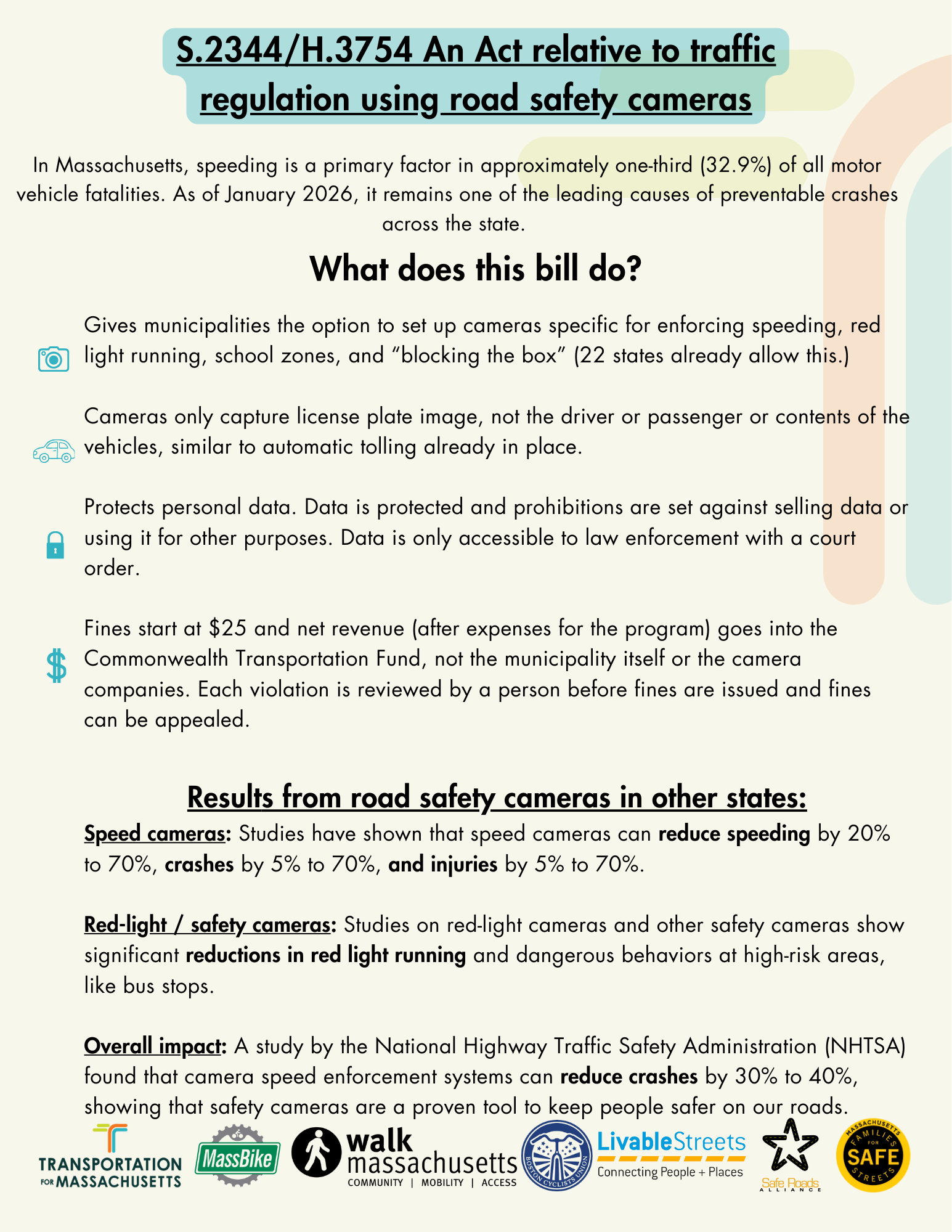 At MassBike, we are feeling optimistic about the bill’s chances this session. The Senate has favorably reported the bill out of the Transportation Committee, and it currently is in Senate Ways and Means, while the identical House version is currently awaiting a reporting from the Transportation Committee, with the deadline of March 18, 2026. we ask you to help us keep pushing to get it out of committee and onto the floor for a vote. Please reach out to your legislators to ask their support and leadership moving the legislation forward - we can’t do it without you!